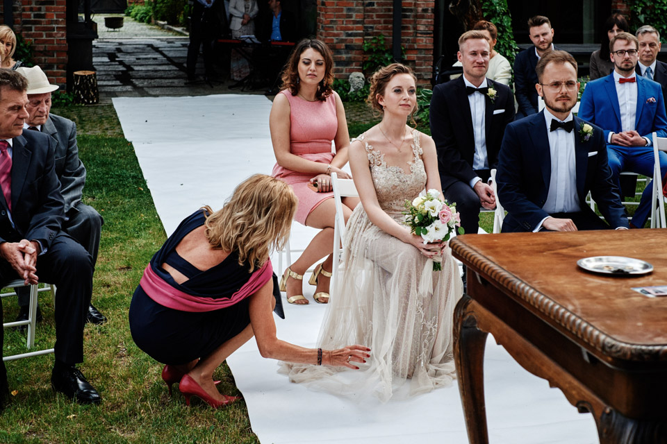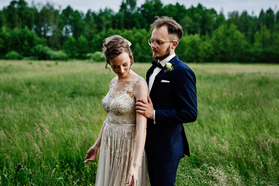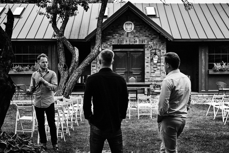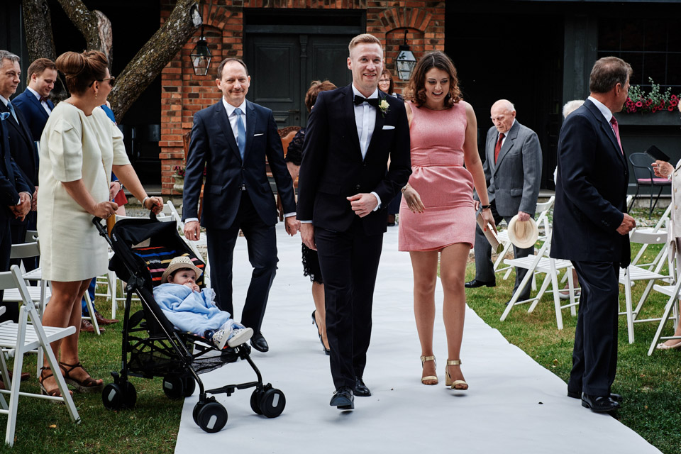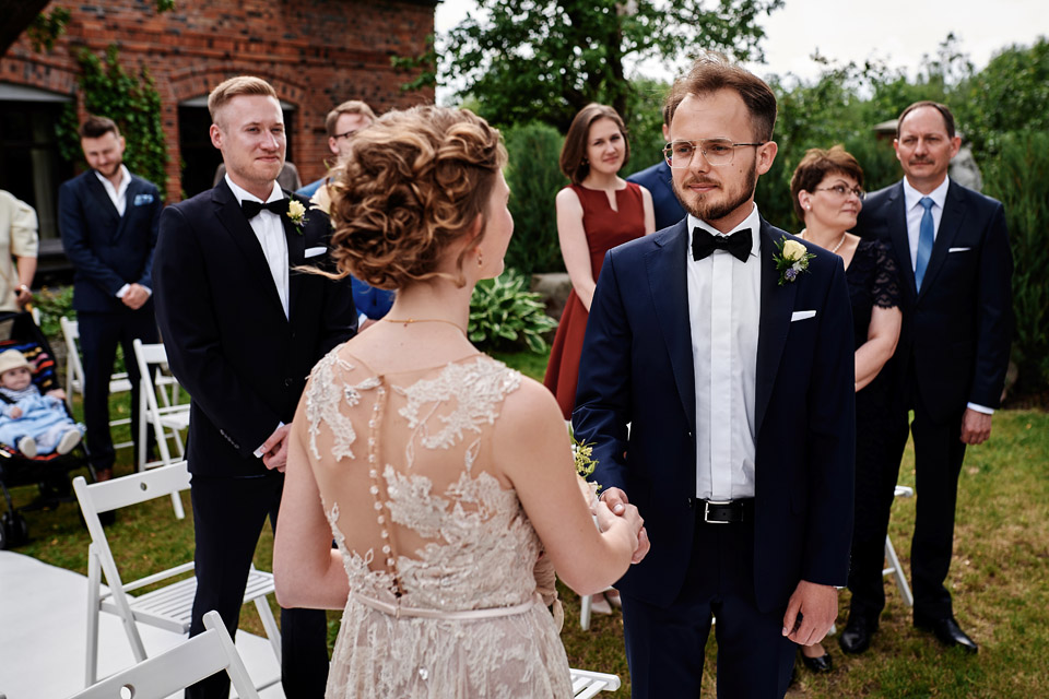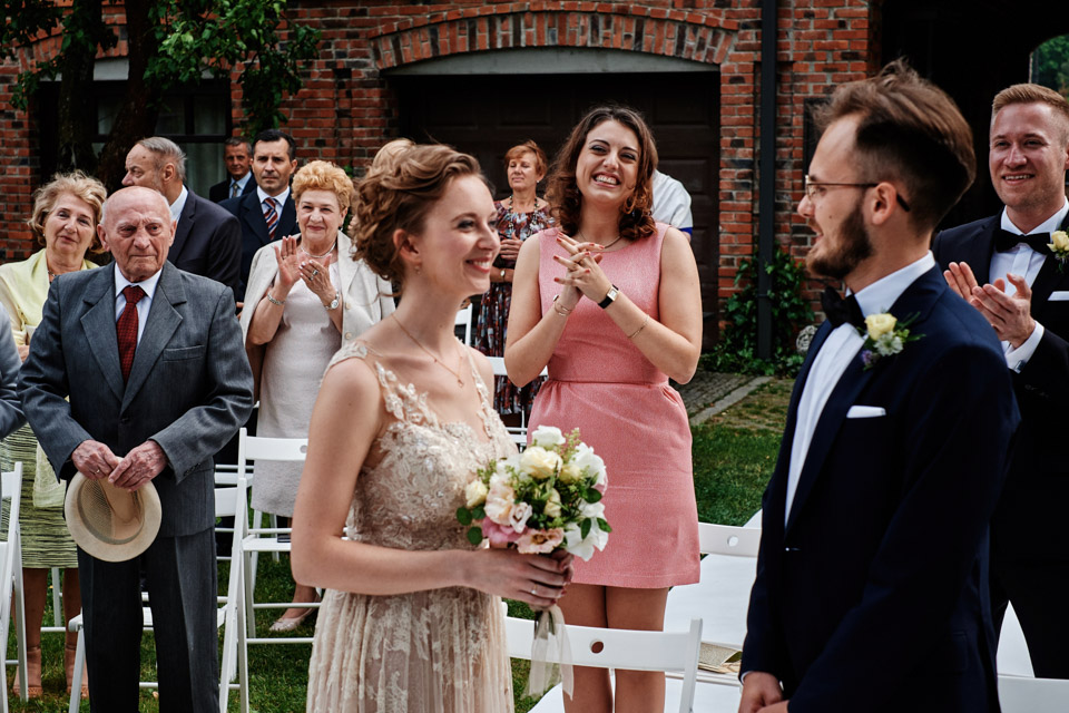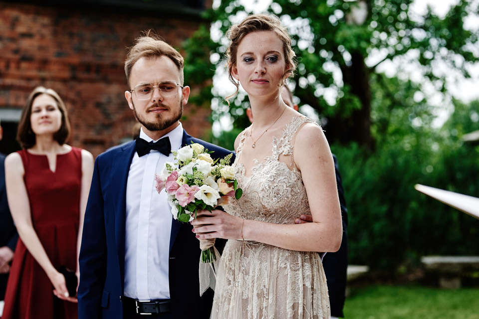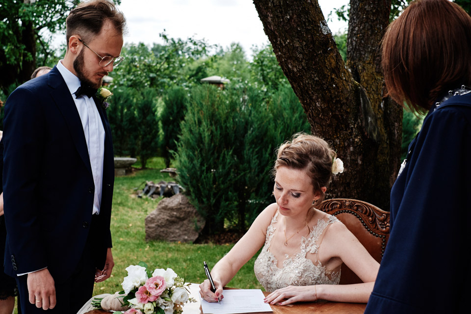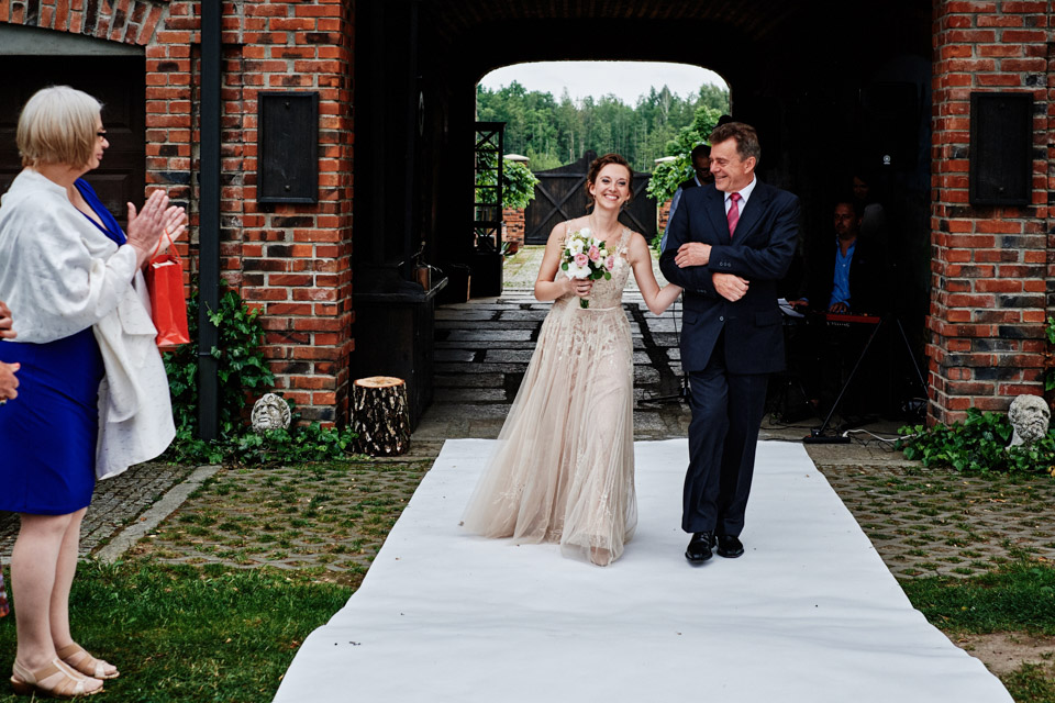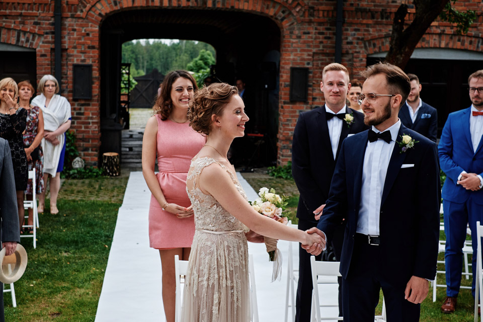Najbliższy kościół był dość daleko ale dla mojej pary to nie problem. Postanowili zorganizować ceremonię cywilną w plenerze – świetny pomysł! Od przygotowań po wesele nie opuszczaliśmy folwarku więc pod kątem logistycznym było to świetne posunięcie. Ślub i wesele organizowane w plenerze dostarczają niepowtarzalnych wrażeń, a fotografie na łonie natury są jedną z najpiękniejszych pamiątek ślubnych.