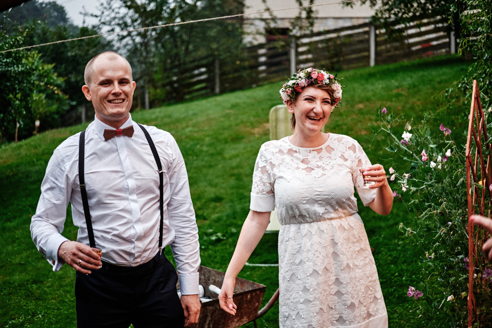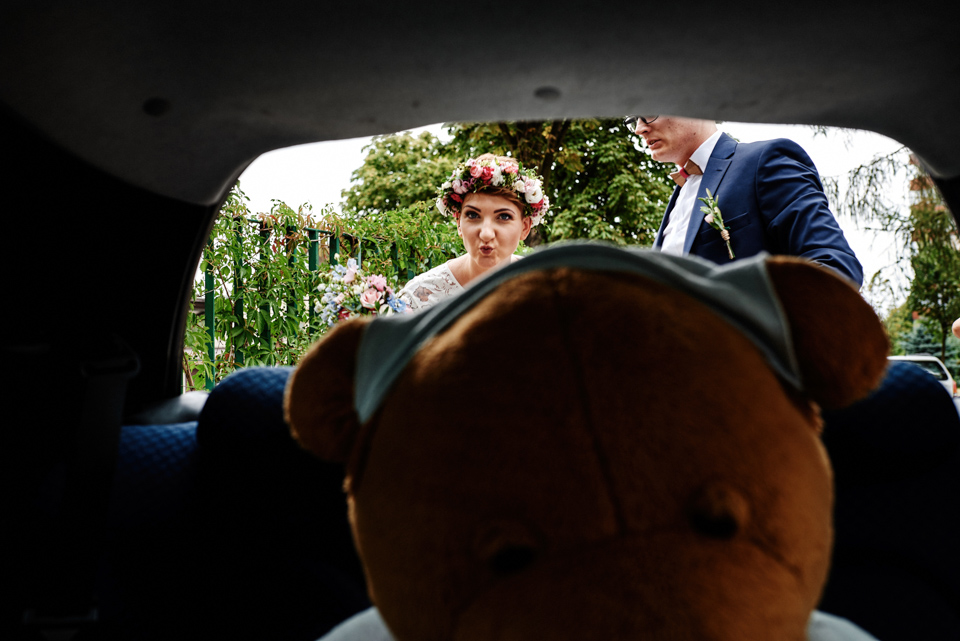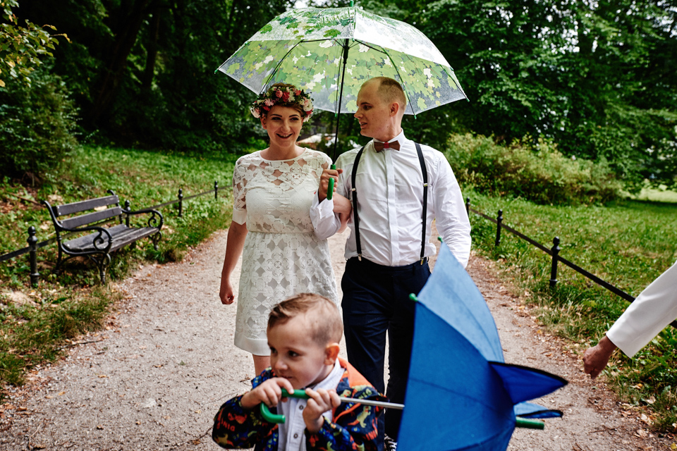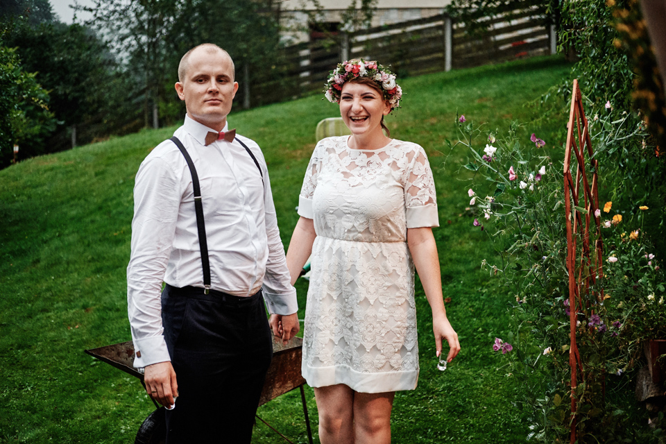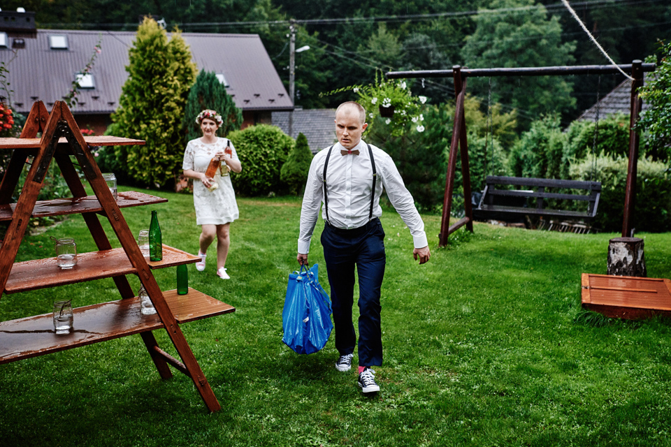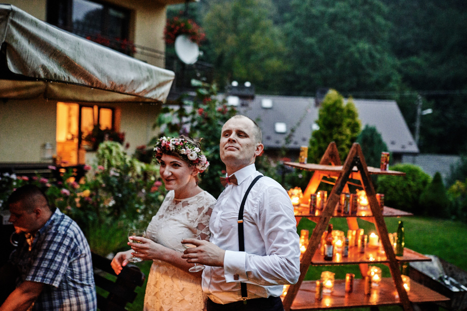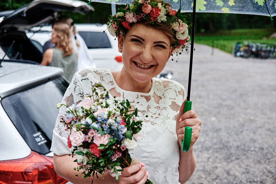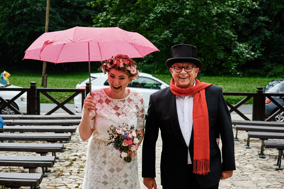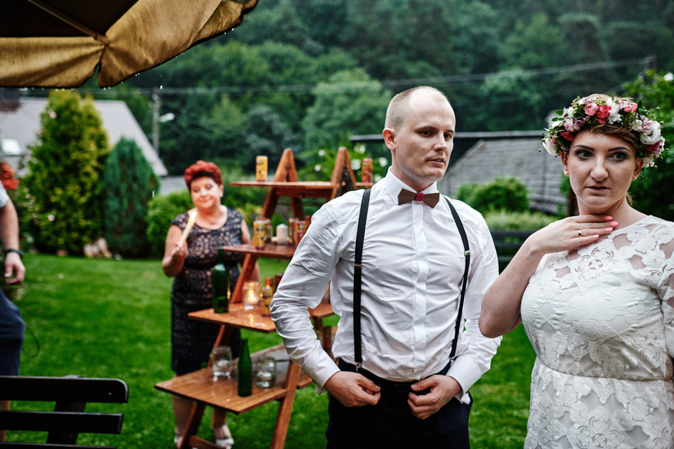 na początek będzie słonecznie ale plenerowe wesele w deszczu i przemoknięta para młoda to niecodzienny widok. Ale jeśli ktoś maluje swoje auto do ślubu flamastrami, zna Beksińskiego i lubi woodstockowe klimaty nie może się przejmować takim detalem jak ulewa.